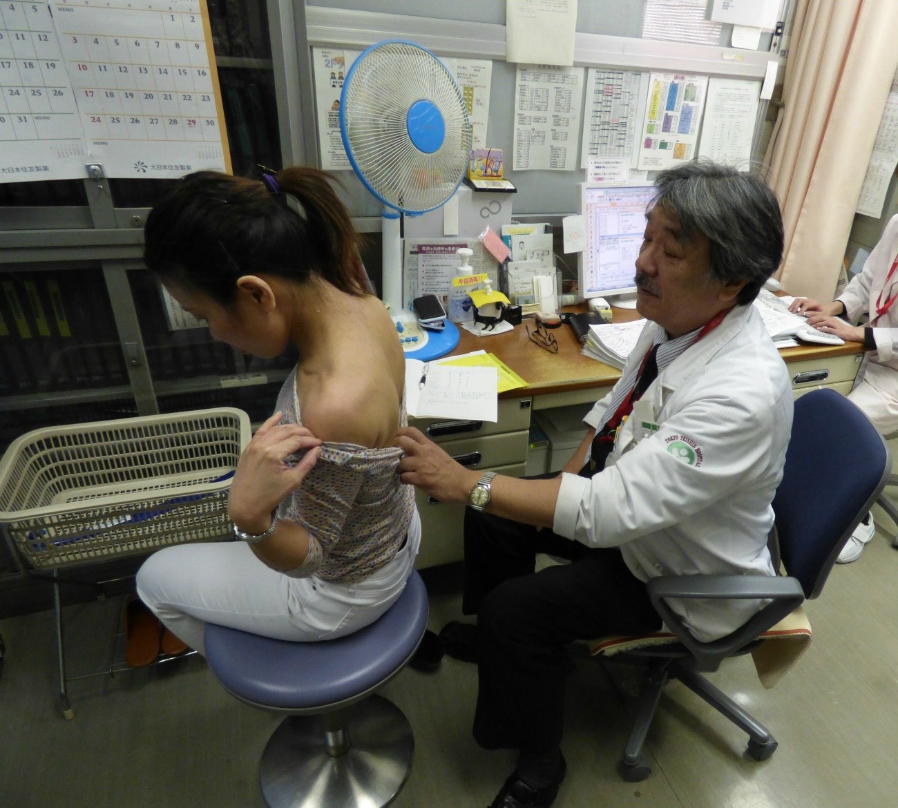 皮膚科の先生は手で炎症度を診ているようです。いわゆる触診。手で触ってゴワゴワ感、乾燥具合を診るそうです。この写真はまさに、触診で炎症度を診ています。